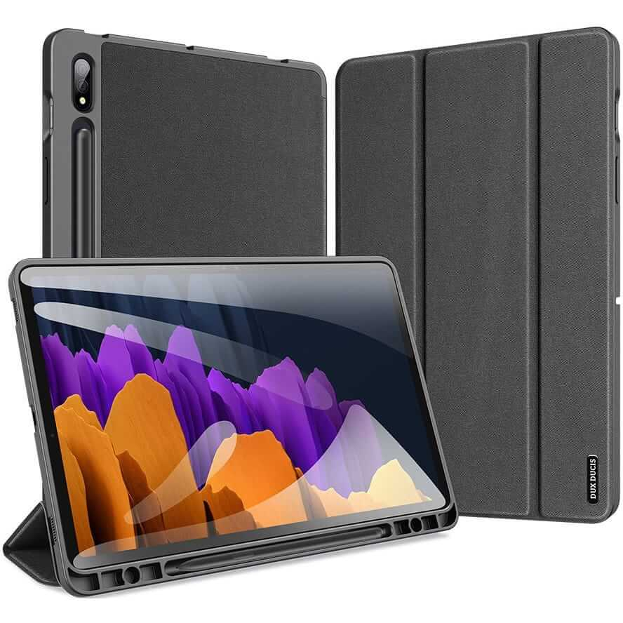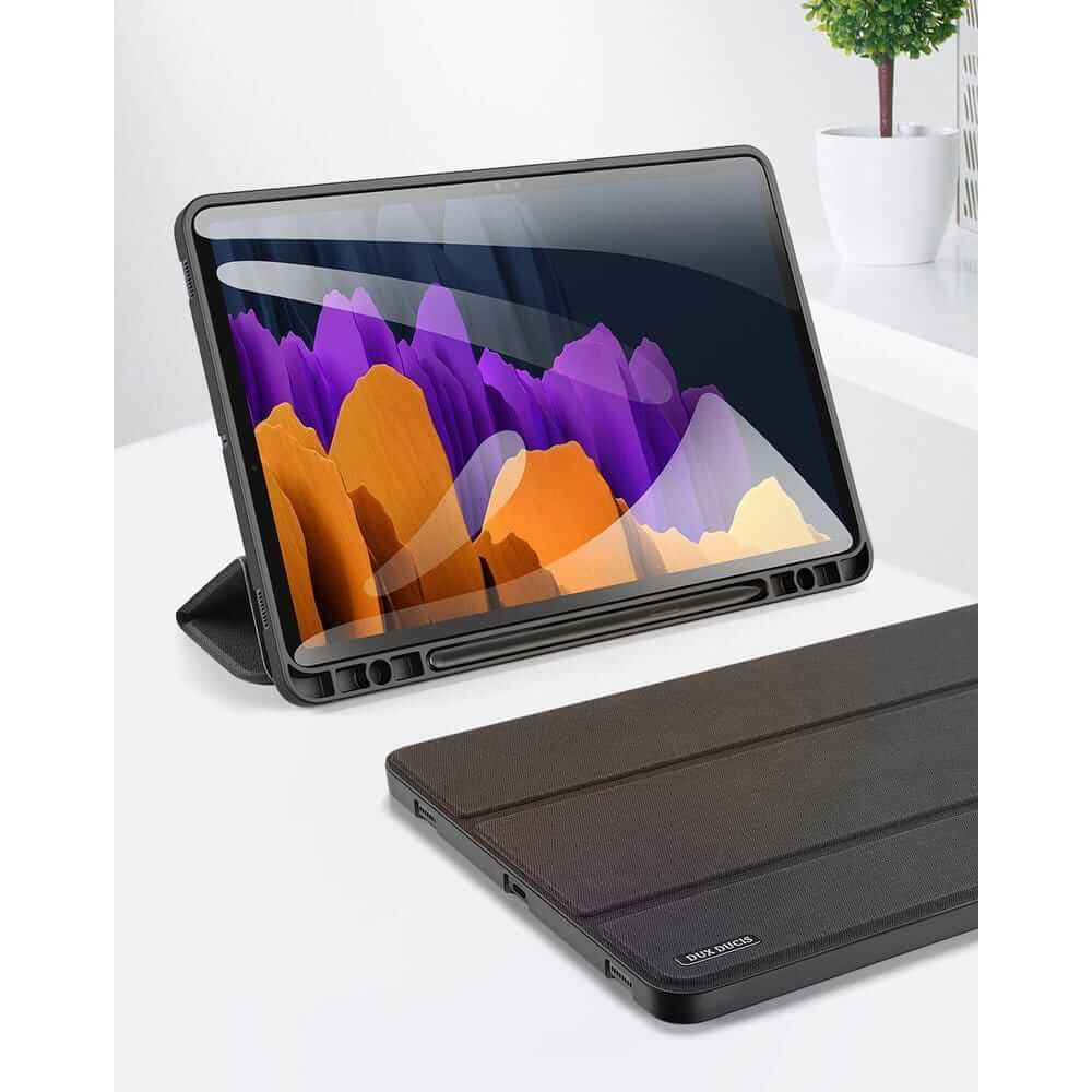 Protejeaza-ti tableta Samsung Galaxy Tab S7 sau S8 cu husa DuxDucis Domo Smartcase, proiectata special pentru modelele SM-X700, SM-X706, SM-T870, SM-T875 si SM-T876B. Aceasta husa ofera protectie completa impotriva zgarieturilor si loviturilor, pastrand in acelasi timp un profil subtire si elegant. Materialele de inalta calitate asigura durabilitate, iar designul sau inteligent iti permite sa accesezi cu usurinta toate porturile si functiile tabletei fara sa indepartezi husa.